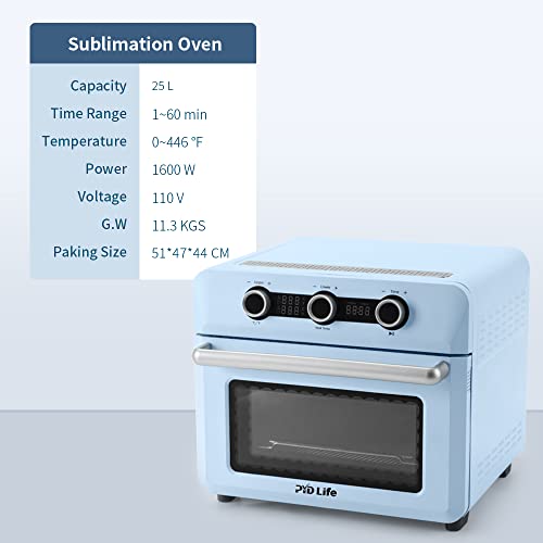 - Specification:The sublimation oven is 1600 W,110 V.Capacity:25 L,Size:L 16.9 x W 16.3 x H 14 Inch.Weight:11.3 kgs .It's just need small work space.
